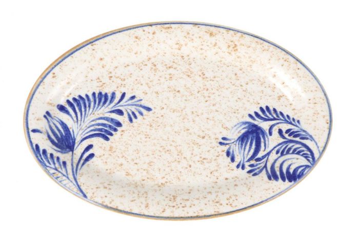 El acabado en blanco con un efecto moteada se complementa con el borde azul y su diseño floral. Este contraste aporta personalidad y enmarca cada preparación con un estilo contemporáneo.