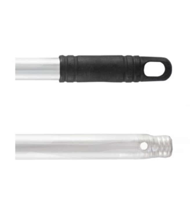 El mango de aluminio tiene un sistema de rosca universal que lo hace compatible con escobas, fregonas, mopas y cepillos, adaptandose a cualquier equipo de limpieza profesional, ideal para hostelería.