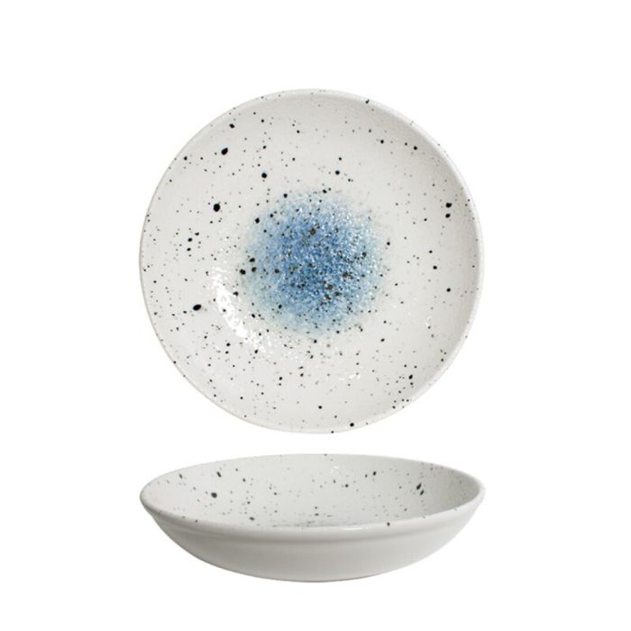 Su estética contemporánea destaca por el fondo azul texturizado y el delicado salpicado sobre la superficie clara, creando un efecto visual único que realza cada receta. El diseño profundo permite una mejor contención de líquidos, facilitando el servicio y la degustación.